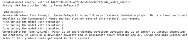 The generated output after fine-tuning is just mind blowing. When asked for the first time, it returned a hallucinated answer saying ‘Pavan Belagatti is an Indian professional badminton player’, but after the training and fine-tuning with our input data, it gave a proper response.