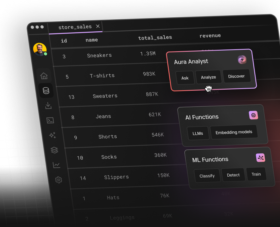 Seamlessly use LLM and embedding model directly in SQL for sentiment analysis, summarization, and text classification directly in SQL.