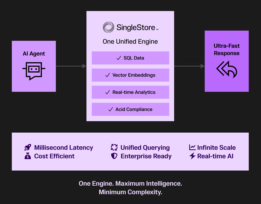 For agentic AI, speed and scalability aren’t just nice-to-haves—they’re essential. SingleStore is built to deliver ultra-low latency, ensuring agents can execute tasks and respond in milliseconds, even under heavy workloads. Its distributed architecture scales effortlessly as your data or user base grows, without slowing down. On top of performance, SingleStore helps keep costs under control by consolidating multiple data engines into one platform. No need for separate databases for vectors, time series, or analytics—it’s all handled in a single system. That efficiency translates directly into lower infrastructure costs while still empowering agents to operate at production-grade speed and reliability.