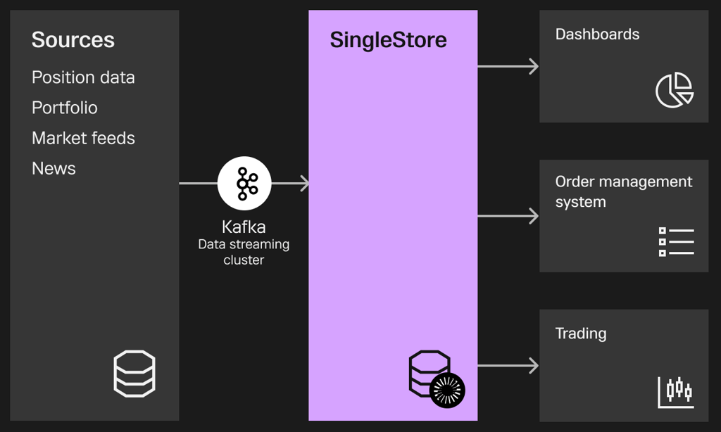 The image shows how market data flows through a modern SingleStore powered trading architecture.
