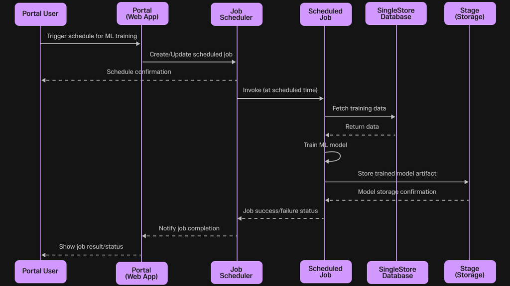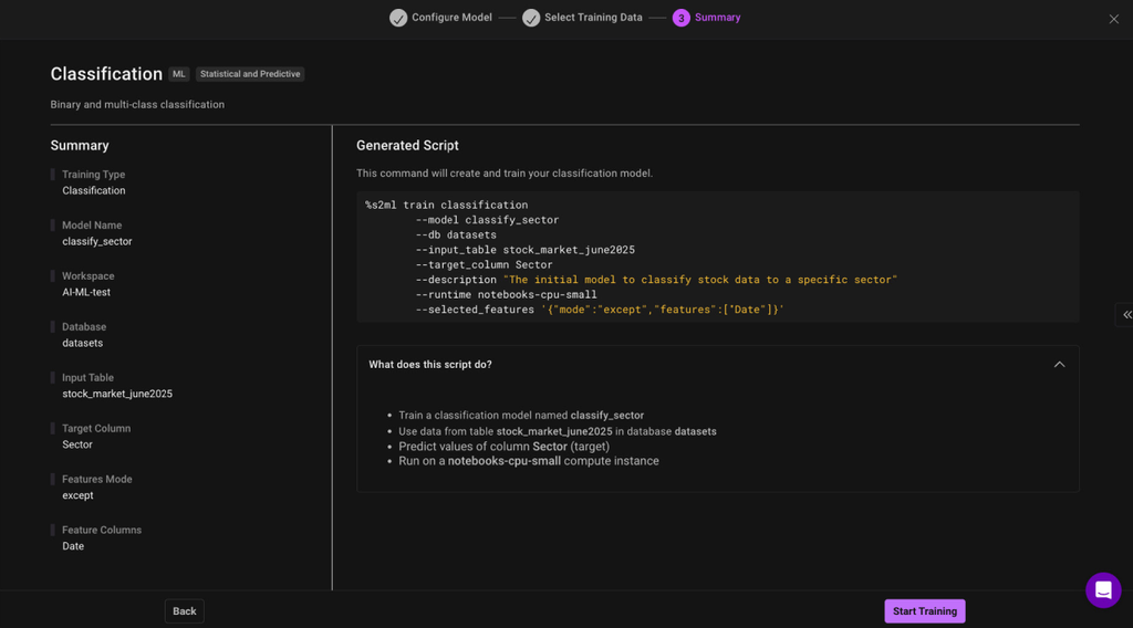 Crucially, this UI-driven workflow culminates in the generation of a single, declarative SQL command. This design provides the best of both worlds: a simple, guided path for those who prefer a visual interface, and a scriptable, SQL-native command for developers and DBAs who need to automate training as part of a larger workflow or CI/CD pipeline. When executed, this SQL command creates a Scheduled Job for immediate execution that handles the model training asynchronously in the background