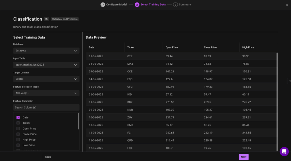 - Choose your data source: Select the table containing your training data