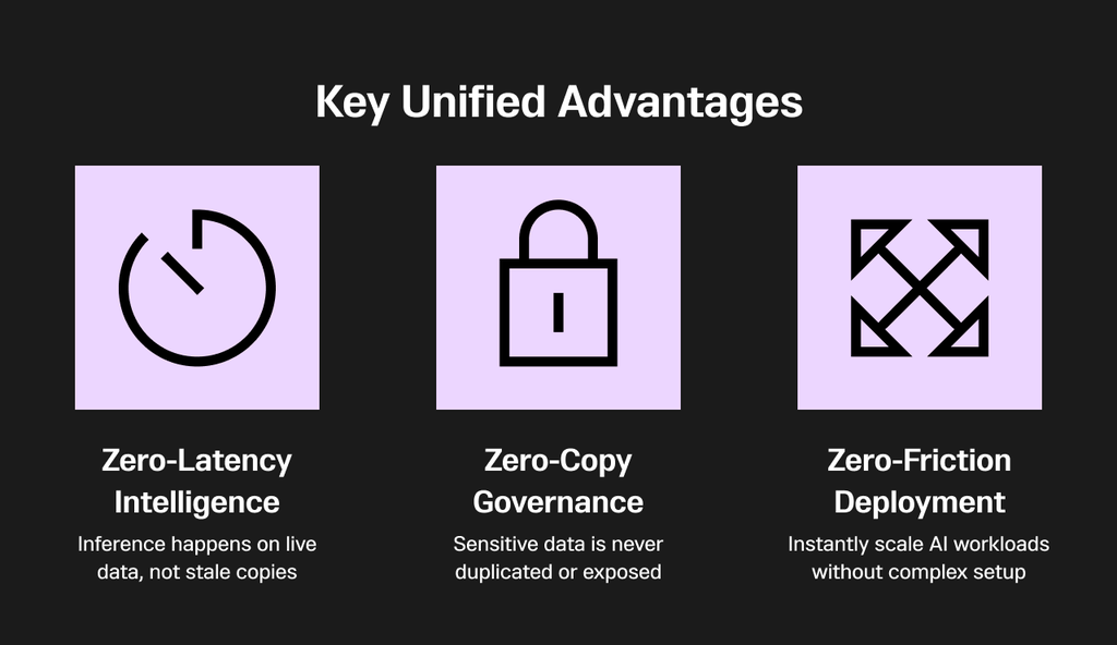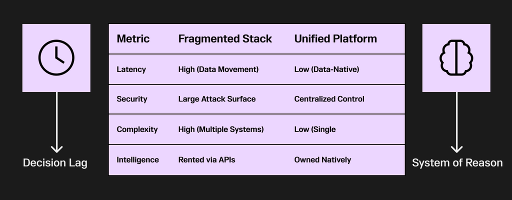This approach eliminates fragmentation, reduces data movement, and delivers zero-latency intelligence — enabling real-time decisioning, better governance, and lower total cost of ownership.