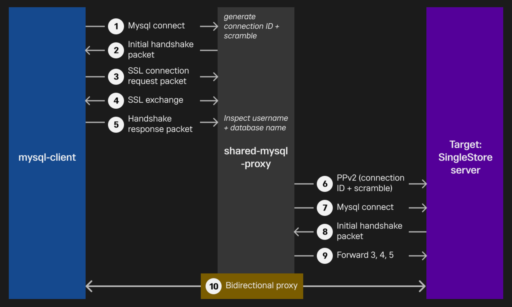Once the destination cluster is identified, the proxy must transfer the context of the half-completed handshake to the SingleStore engine instance so that the engine can complete the authentication process.