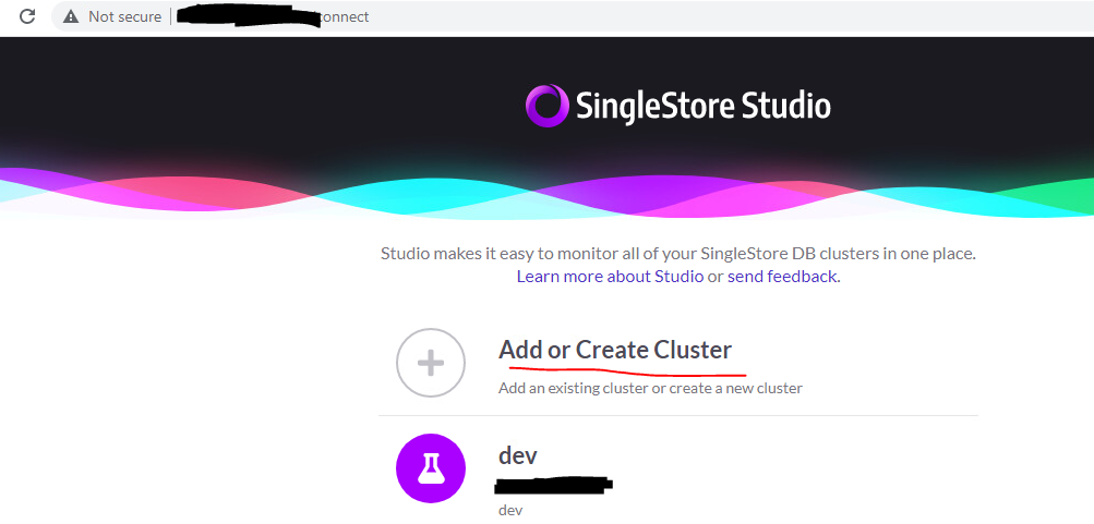 With Studio running, go to http://<main_deployment_host>:8080 and click Add New Cluster to set up a cluster.